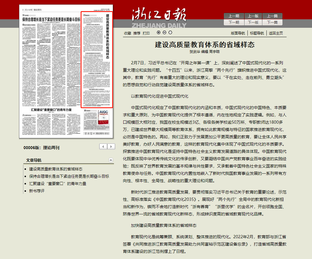 《浙江日报》2023年2月20日第6版全文刊发了公司贺武华教授的文章:《建设高质量教育体系的省域样态》,全文如下: