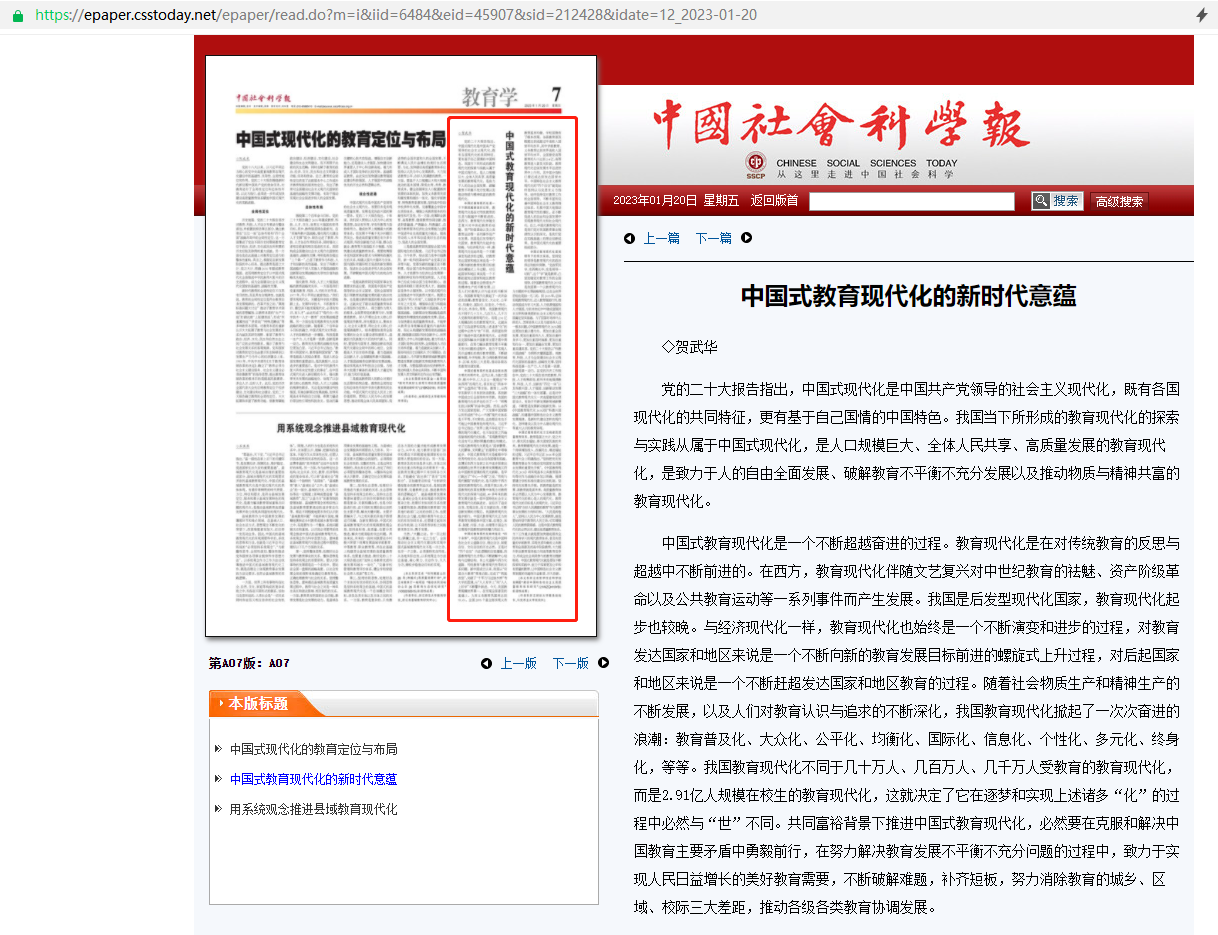 《中国社会科学报》2023年1月20日刊发了公司贺武华教授的文章:《中国式教育现代化的新时代意蕴》,全文如下: