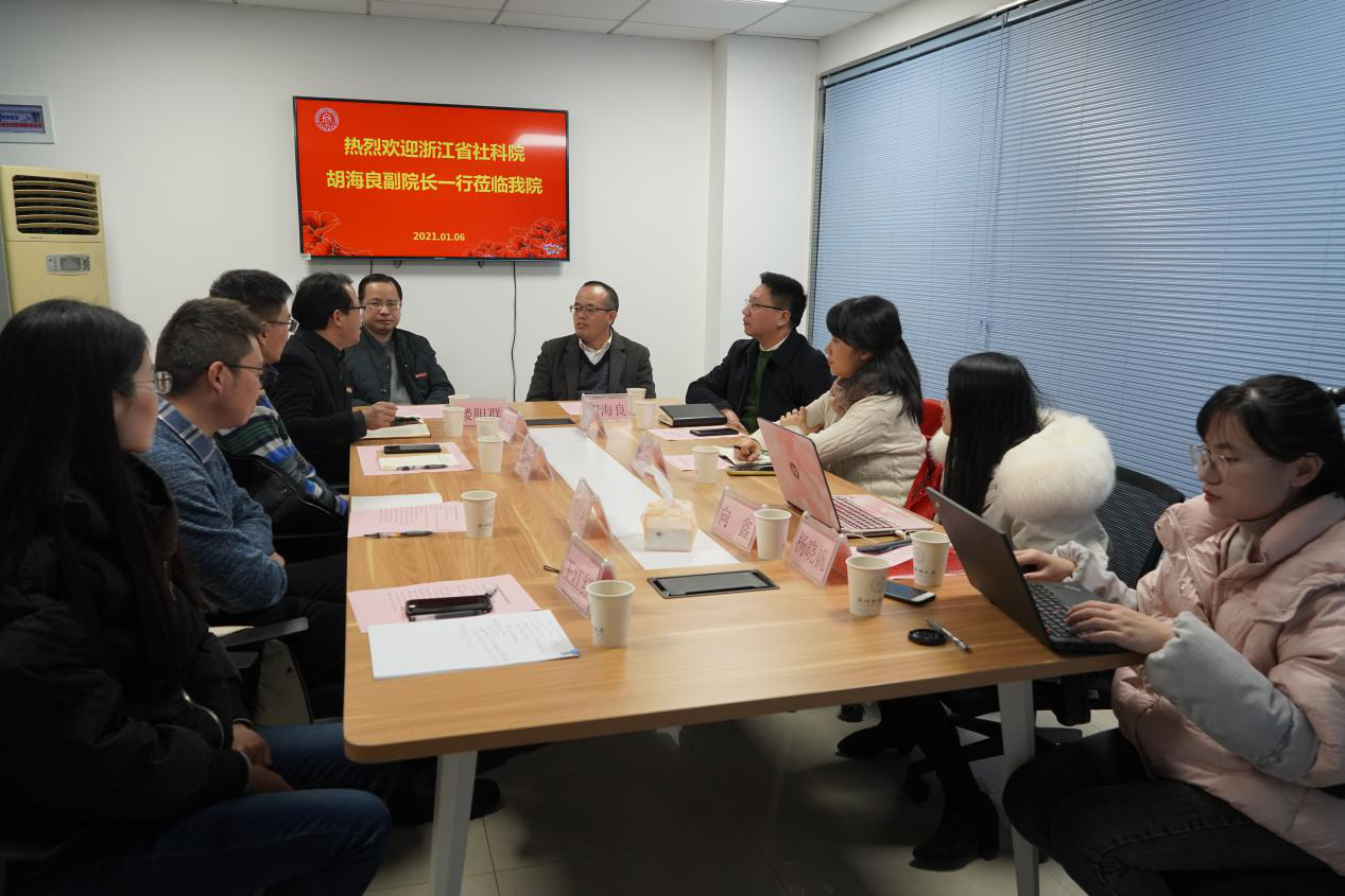 2021年1月6日下午,浙江省社科院副经理、省中国特色社会主义理论体系研究中心副主任、秘书长胡海良副经理,省社科院政治学研究所所长、省中国特色社会主义理论体系研究中心常务副秘书长,省社科院政治学研究所副所长唐玉来公司调研马克思主义理论学科以及中特理论研究基地建设工作。公司党委委员、宣传部长楼胆群与会,公司党委书记、经理贺武华,马原教研室主任韩跃民,以及教师代表胡洪彬教授,向鑫、王江红、杨晓帆三位博士等参加座谈。座谈会由贺武华主持。