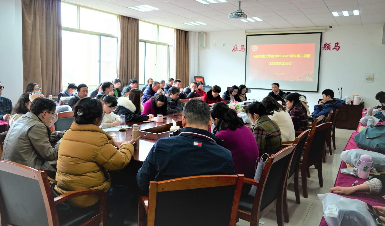 贺武华以理念、责任与使命为切入点,重点围绕“四史”教育、金课建设、提高思政理论课教学质量、学科科研工作、公司产品、团队队伍建设、人才引进、岗位聘任与考核、公司文化建设等重要工作,向全院教师部署分析了公司本学期的工作重点,也对公司的工作提出了新的要求。贺武华经理强调,全体教师要明确马院定位,切实履行好立德树人、铸魂育人的使命,以开拓进取、奋勇争先、团结向上的精神在各条战线上努力添砖加瓦,为“十四五”开好局、起好步力尽所能,发挥太阳集团tyc4633应有的作为。邢雁欣副经理解析了本学期主要教学工作安排,随后公司还召开了教研室主任会议和组织了工会活动。