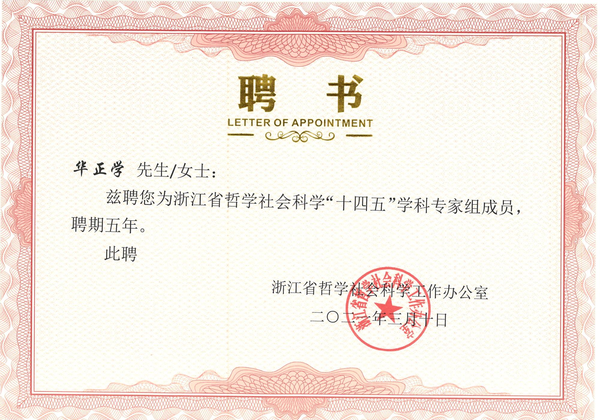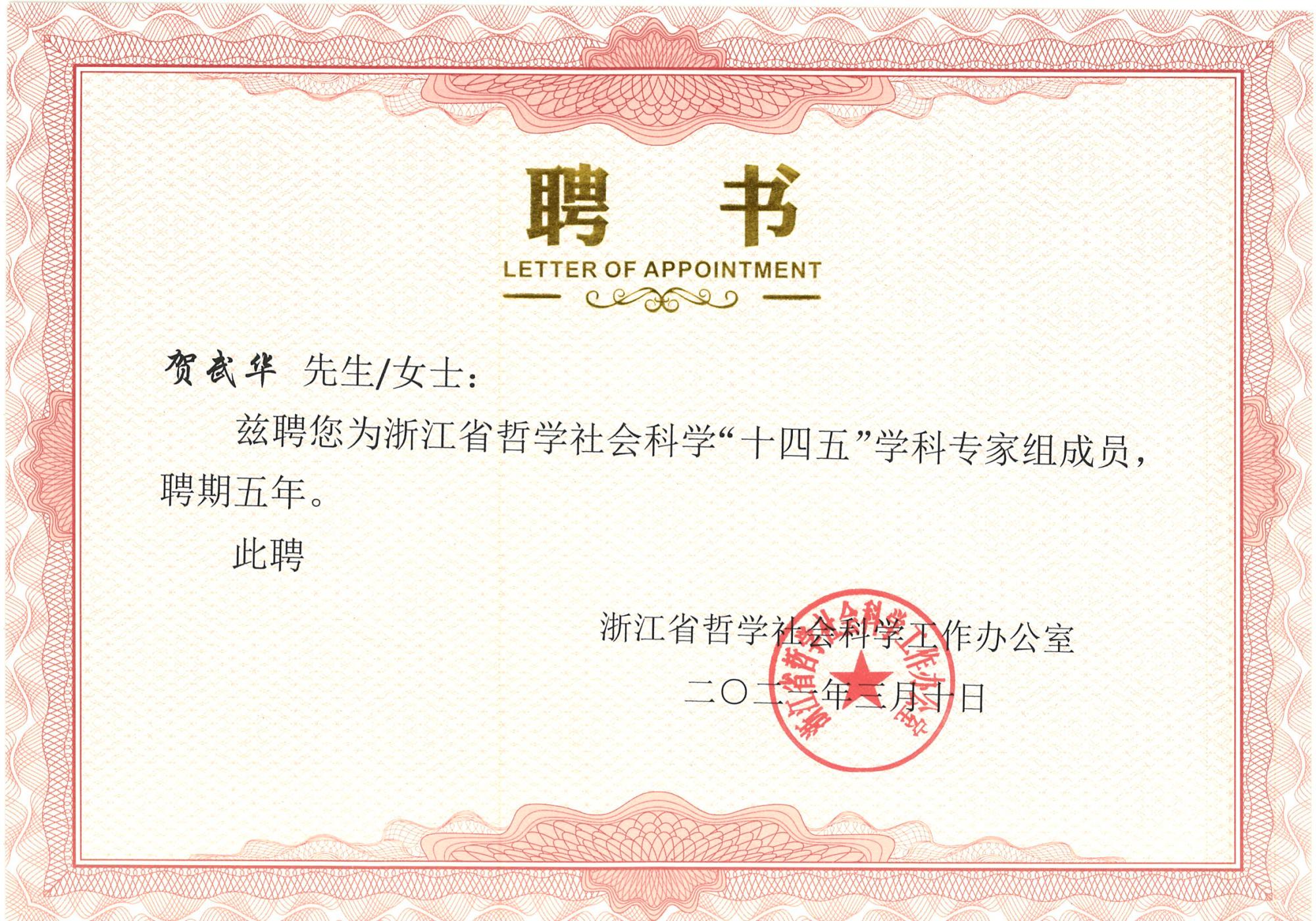 近日,浙江省社会科学发展规划领导小组公布了浙江省哲学社会科学“十四五”学科专家组成员名单。公司贺武华教授、华正学教授被聘为浙江哲学社会科学“十四五”学科专家组成员,聘期五年。