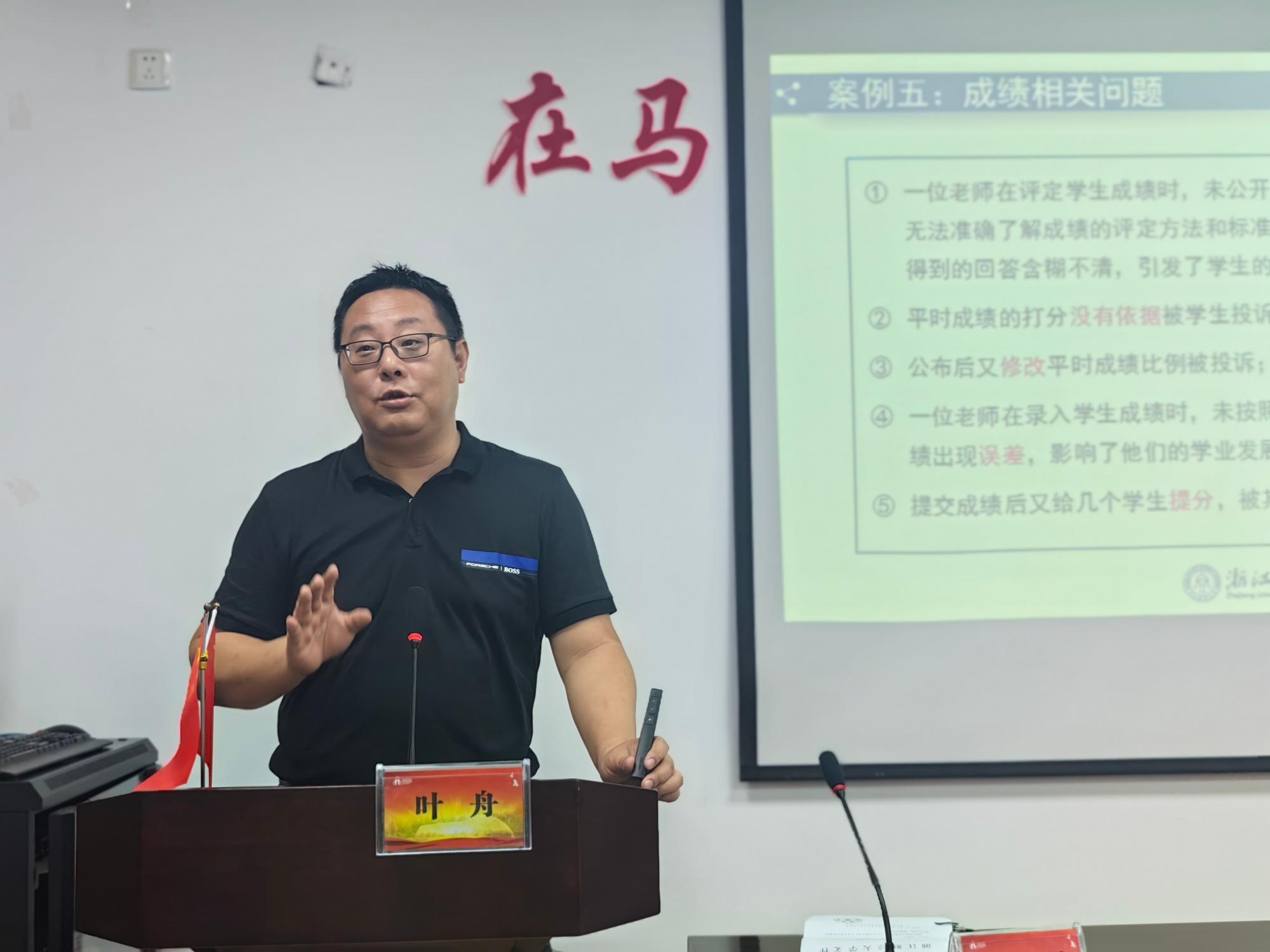 最后,教务处副处长叶舟受邀为公司作题为“教学工作规范与教学事故防范”的培训会。叶舟围绕“课堂教学注意事项”“教师监考注意事项”“教师言行注意事项”三个方面就公司教学规范和本科教学质量提升进行讲解。叶舟以案说理,结合《太阳集团教学事故认定及处理办法》以及近年来发生在公司的各类教学事故,详细解读了各个教学环节的教学事故风险和注意事项,尤其强调了教师迟到早退、言行失范、监考不负责任等现象的危害,帮助老师们快速了解公司的教学工作规程、教学事故认定与处理办法等教学规范相关内容。叶舟副处长还结合自身长期教学工作经验,就如何落实教学常规、提升课堂教学质量进行了详实的讲解和指导,并强调了师德师风的重要性。