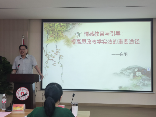 本次培训的主题是“以情感共鸣为进路提升思政课教学质量”。白羽教授做了题为“情感教育与引导:提高思政教学实效的重要途径”的专题讲座。白老师结合自己多年的教学经验和经历,从以“情”导入、合乎“情”理、共“情”沟通、倾“情”教学四个方面分析了如何通过情感引导提升思政课教学过程中的师生交互效能。