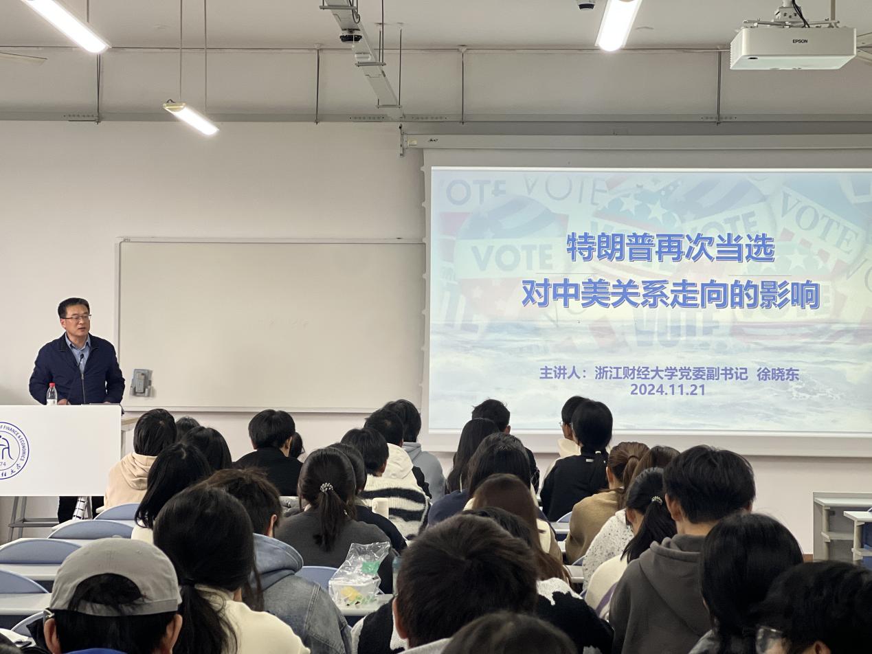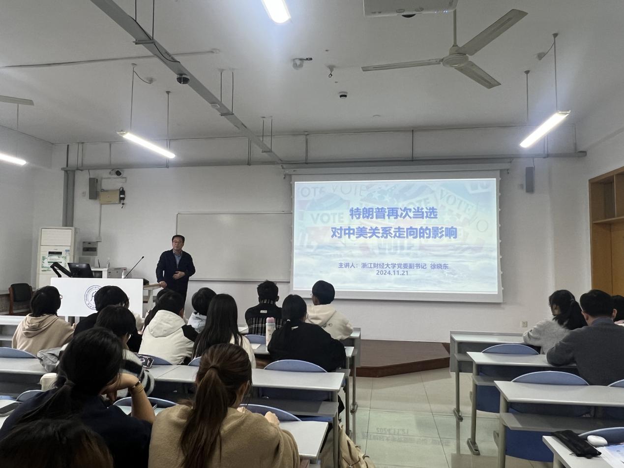 徐书记从政治及外交层面、经济与贸易层面、社会与文化层面、科技与创新层面深度剖析了特朗普再次当选后可能对中美关系产生的影响,并就当代中国老员工如何应对当前局势提供了建议,鼓励同学们加强对国际局势和多元文化的理解、提升专业技能和创新能力、增强英语和跨文化沟通能力、保持开放心态,注重理性思考、探索多元化职业路径。