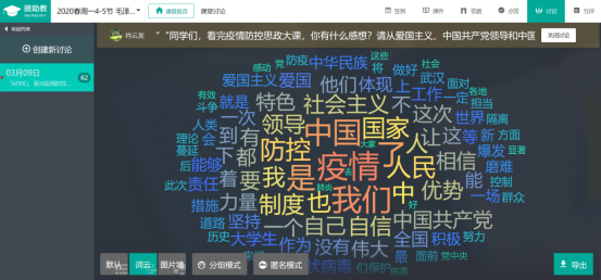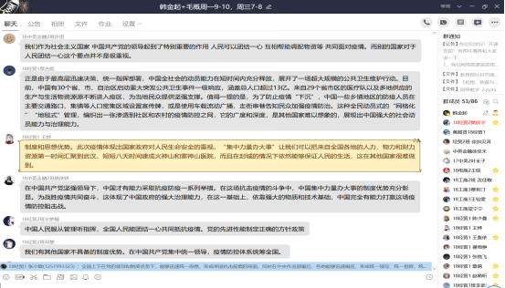 “抗疫,我们有中国制度”、“战疫时期的青年责任与担当”、“自然、疫情与我”、“重大疫情与敬畏生命”、“致敬医护人员”等等,这些都是马院老师在直播结束后和员工讨论的主题,而每一个问题之下都有数百条甚至上千条员工的热烈回应。韩金起老师班上18经贸1班的王烨同学追问“此次疫情防控过程中,哪些做法在中国可以做到,其他国家不可以,我们的优势有哪些?”来自肖云龙老师班上的寇雅洁同学从爱国主义、中国共产党领导和中国特色社会主义制度的显著优势和“四个自信”的角度分别谈了自己的看法;冯庆旭老师班上的郑烨波同学认为:“在重大疫情面前,生命可以脆弱的只是一个个冰冷的数字,同时生命也是顽强的,顽强到可以奋不顾身的奔赴战场。此次疫情让我们看到了青年的力量,也让我感受到了自我担当意识,危险当前,总是有人要付出,别人可为,我为何不可为呢?”
