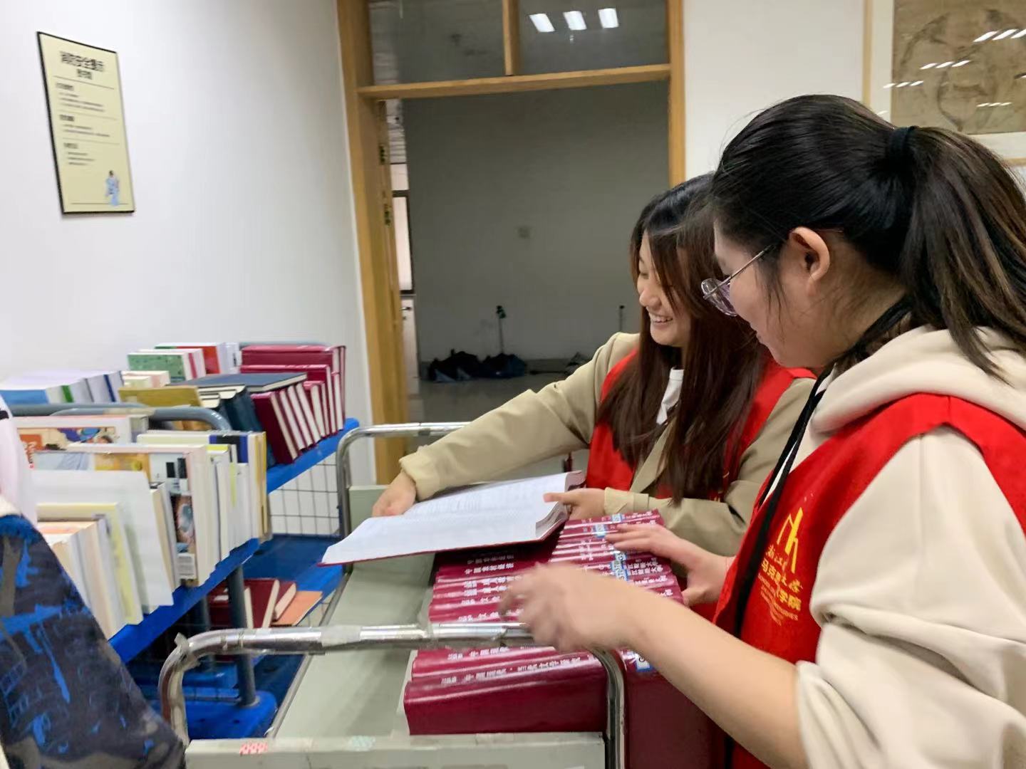 志愿者们于13:40到达图书馆大厅集合,签到完成后便立⻢投入到志愿活动中。本次志愿活动的主要内容是协助图书馆工作人员进行书籍整理工作。首先,志愿者们在图书馆指导老师的带领下进 入一楼密集型书库,学习如何将新书粘贴条形码及序列号标签,随后,志愿者们分工合作按照序 号、目录整理摆放书籍,以待后续书籍的信息录入。
