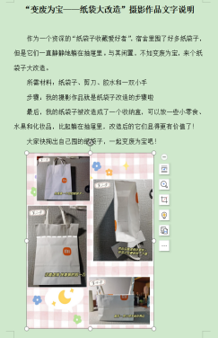 此活动开展持续一周,活动期间,同学们以“我最节约”为主题并附上自己拍摄的最节约的照片、制作的废物利用的手工物、视频等多种形式,从“变废为宝”、“节约用水”、“节约用电”、“节约粮食”等方面展开参与活动。19日,由党支部代表和团支部代表共同对参赛作品进行评比。此次活动,同学参与热情高涨,作品也贴近生活反应生活中的节约现象,有“我光盘我光荣”的光盘行动,有收集废品制作作品的废物利用方式,也有财大学子厉行节约珍惜资源的良好品德……生活中的节约美德现象都被他们记录下来。最后,赵紫荣、张旭龙(寝室)、李海萍、李丽、张博文、杨再来等六组作品获得优秀奖。