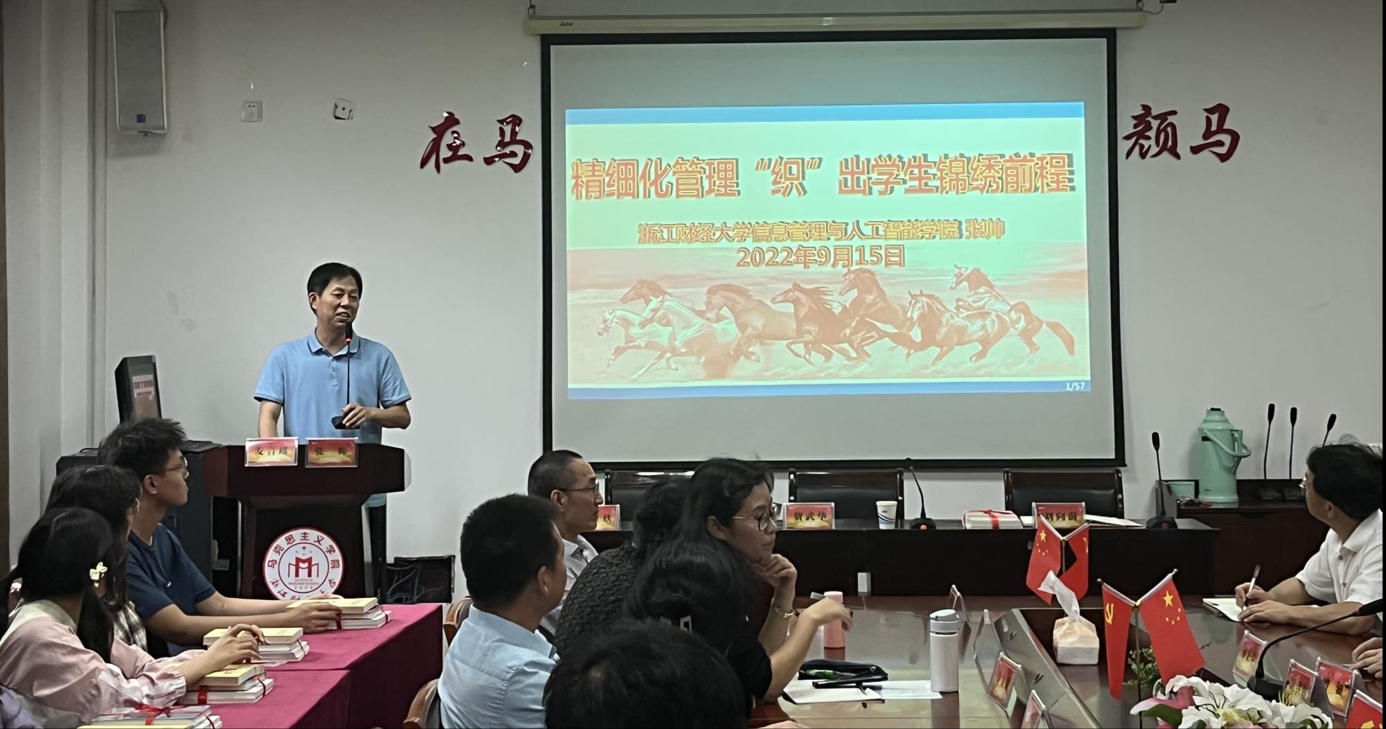 特邀嘉宾,来自信息技术与人工智能公司的经理张帅教授作专题发言。张经理以“精细化管理,织出员工锦绣前程”为主题,向大家分享了信智公司多年来培养研究生的丰硕成果与实践经验,并将他们总结的多项培养举措一一向大家说明,在场的老师和同学都受益匪浅。